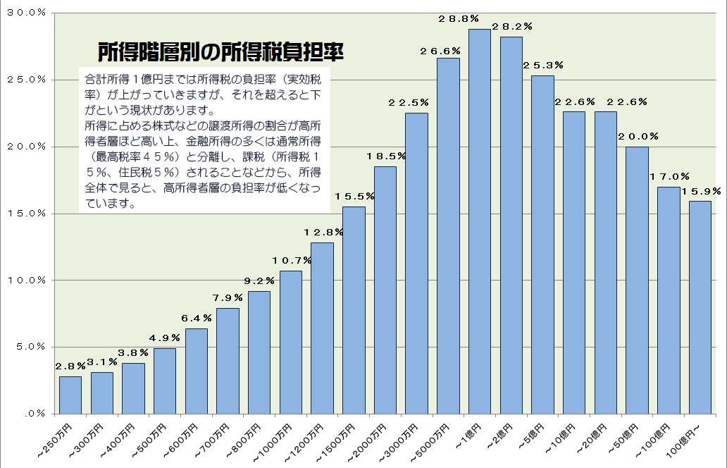 その理由として、所得に占める株式などの譲渡所得の割合が高所得者層ほど高い上、金融所得の多くは通常所得(最高税率45%)と分離し、課税(所得税15%、住民税5%)されることなどから、所得全体で見ると、高所得者層の負担率が低くなっています。