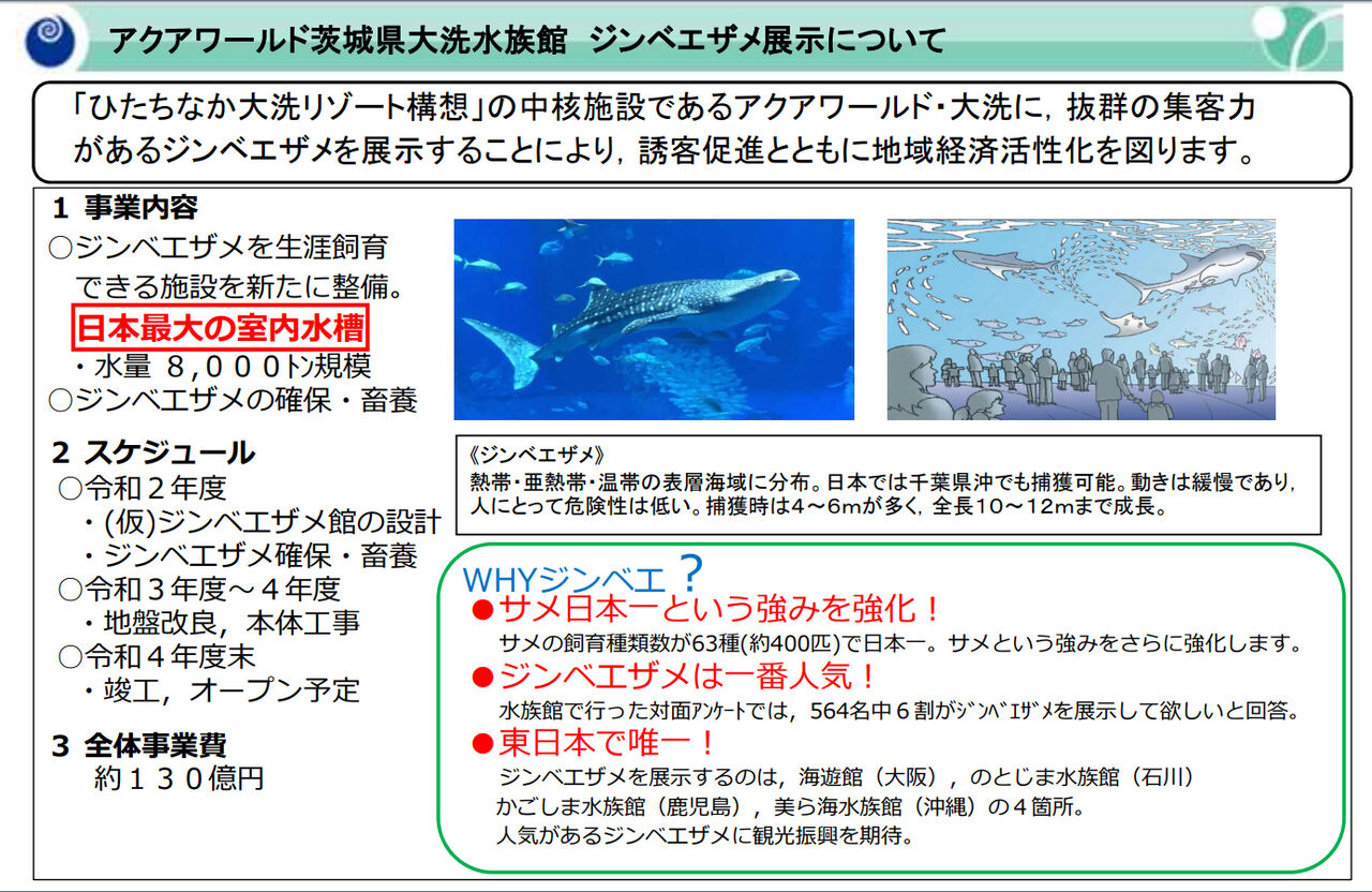 茨城県は来年度から調査費を計上して事業化に着手するとともに、定置網などにジンベエザメが入って捕獲されるのを待ち、3〜4年以内にはジンベエザメを展示できるようにします。