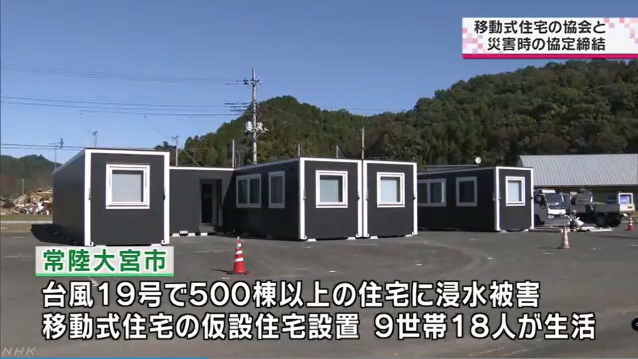 1月16日、災害時にいち早く仮設住宅を設置し、被災者が入居できるようにしようと、2019年台風19号で大きな被害が出た常陸大宮市が、一般社団法人日本ムービングハウ協会と協定を締結しました。