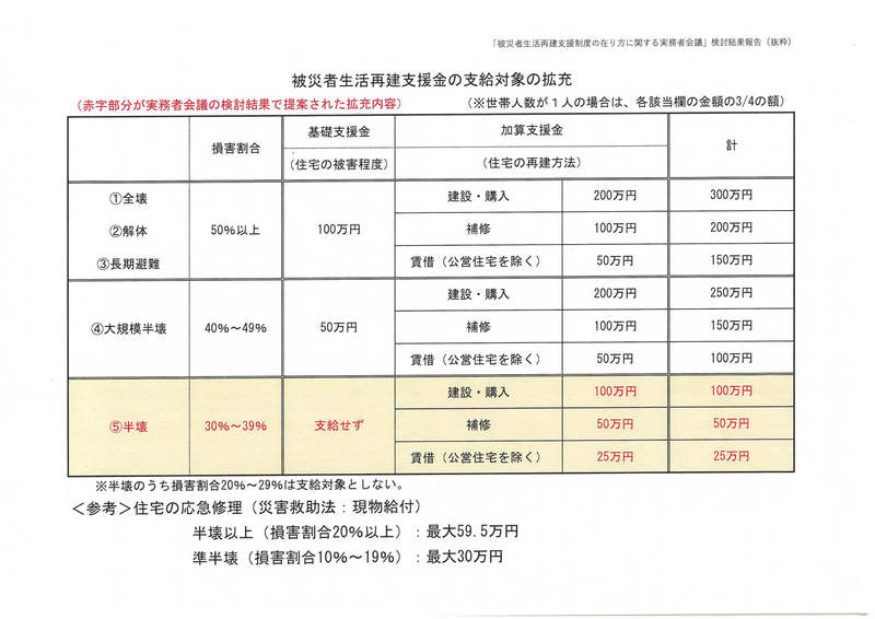 ただ、近年の災害を通じて、半壊扱いとなる住宅の損害割合が幅広いため、半壊の中でも比較的大きな被害を受けた世帯に対する支援が不十分との声が寄せられていました。