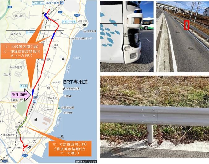 バスは、午前9時50分に大甕駅西口を多賀駅に向けて出発。常陸多賀駅方面に50メートルほど走行したところで、バスの右前方部分が右側ガードレールに接触しました。一般乗客は乗車しておらず、運転手含めた乗員3名にもけがはありませんでした。今回の実験路ではその特性により二つの位置推定手法(GNSS方式と磁気マーカー方式により位置推定)を使い分けていますが、事案発生地点はそれらの位置推定手法が切り替わる地点でした。約30km/hの速度で自動走行中に、当該地点でハンドルが右に急旋回し、運転手が速やかにブレーキ及びハンドル操作による介入をしたものの、間に合わずガードレールへの接触に至りました。