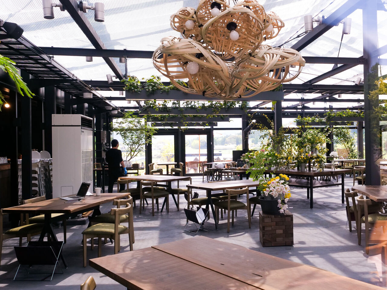 園内中央に新設した飲食施設「ローズファームハウス」は「バラ農家からの招待」をコンセプトに、食事やまき割り、ハーブ摘み取りなどが体験できる工夫も凝らされます。全面ガラス張りの店内は開放感あふれ、爽やかな風が吹き抜けるテラス席も魅力です。