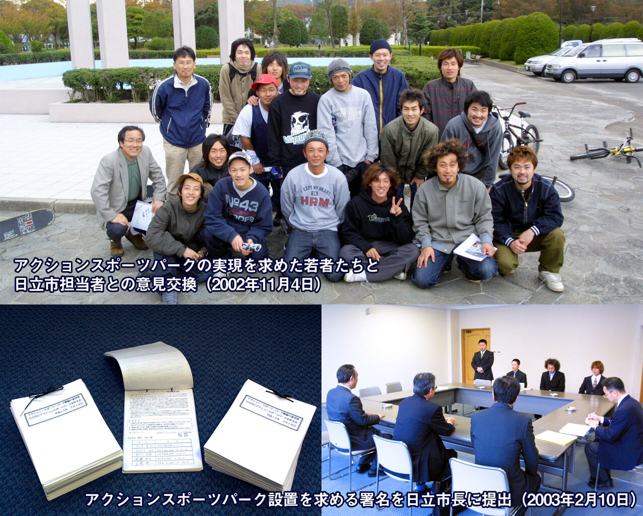 2002年11月、池の川の総合運動公園に、若者を中心とする愛好者20名ほどが集まり、スケートボードやBMXが気軽に安全にできる公園整備を整備してもらいたいと、日立市に要望書を提出することと、そのために署名運動を行うことが決まりました。