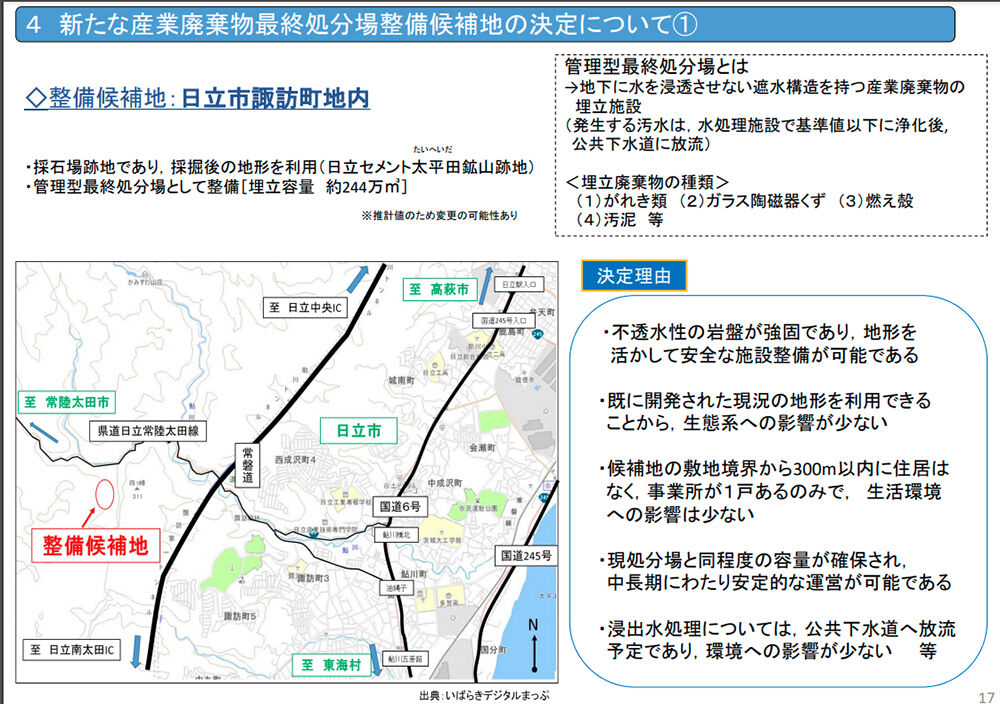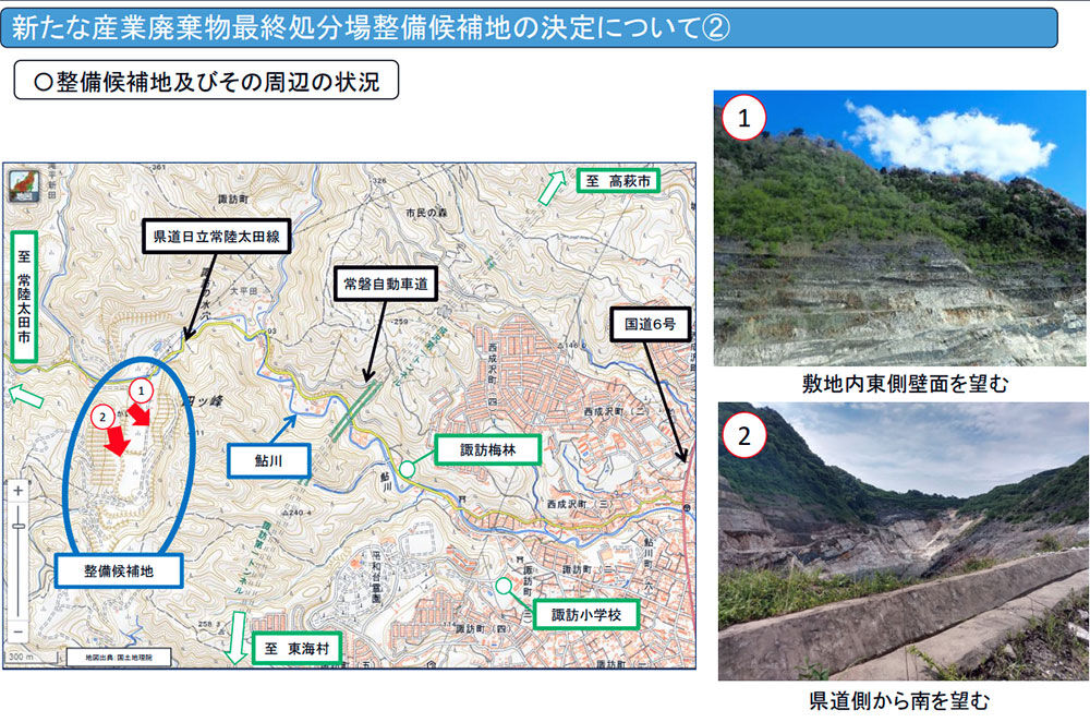茨城県が関与する新たな産業廃棄物最終処分場の候補地として、茨城県が日立市諏訪町の採石場跡地(旧日立セメント太平田鉱山)を選定したことを巡り、日立市の小川春樹市長は「県の要請を受け入れることを決意した」と市議会全員協議会で述べ、処分場受け入れを正式に表明しました。