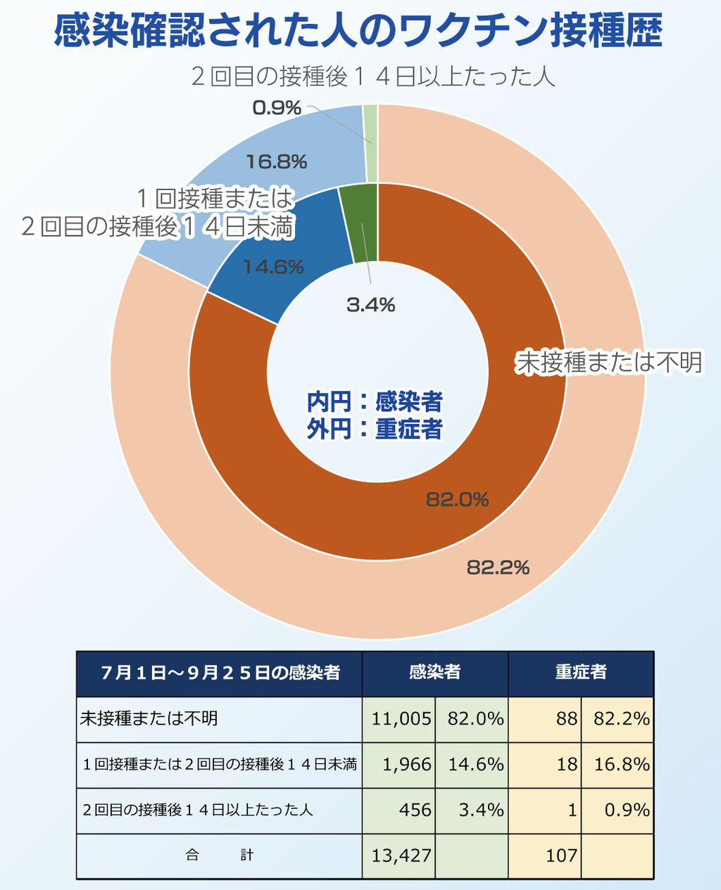 (円グラフは、7月1日〜9月25日の感染者のワクチン接種経歴)