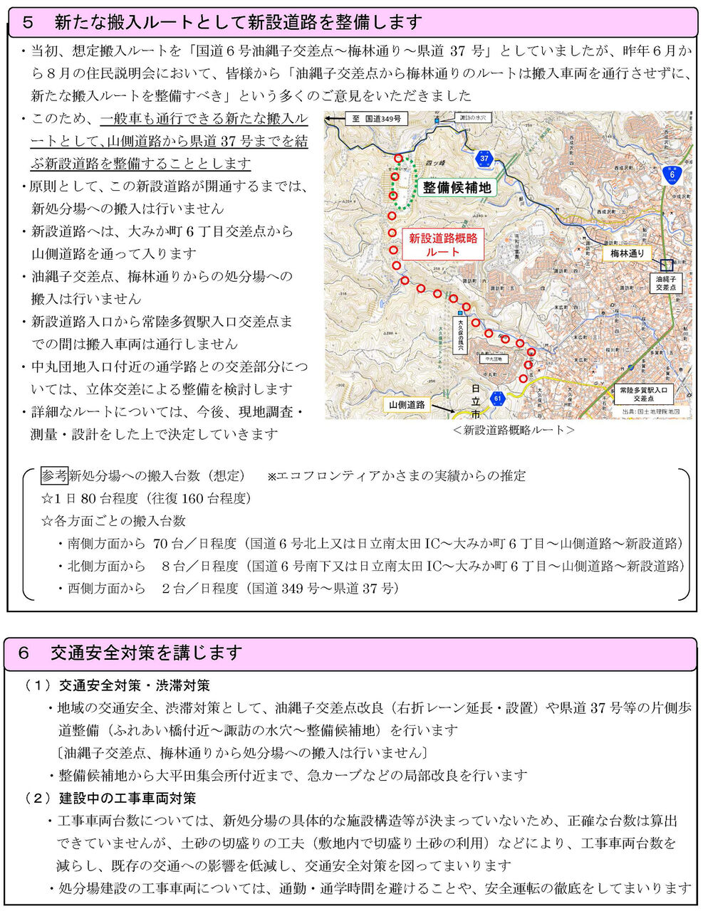 新たな搬入ルートとなる新設道路は、山側道路から県道日立常陸太田線までを結ぶ4kmで計画している。大みか町6丁目交差点から山側道路を通って入るほか、中丸団地入口付近の通学路との交差部分が立体交差を検討しています。パシフィックコンサルタンツ(千代田区)が予備設計を手掛けています。