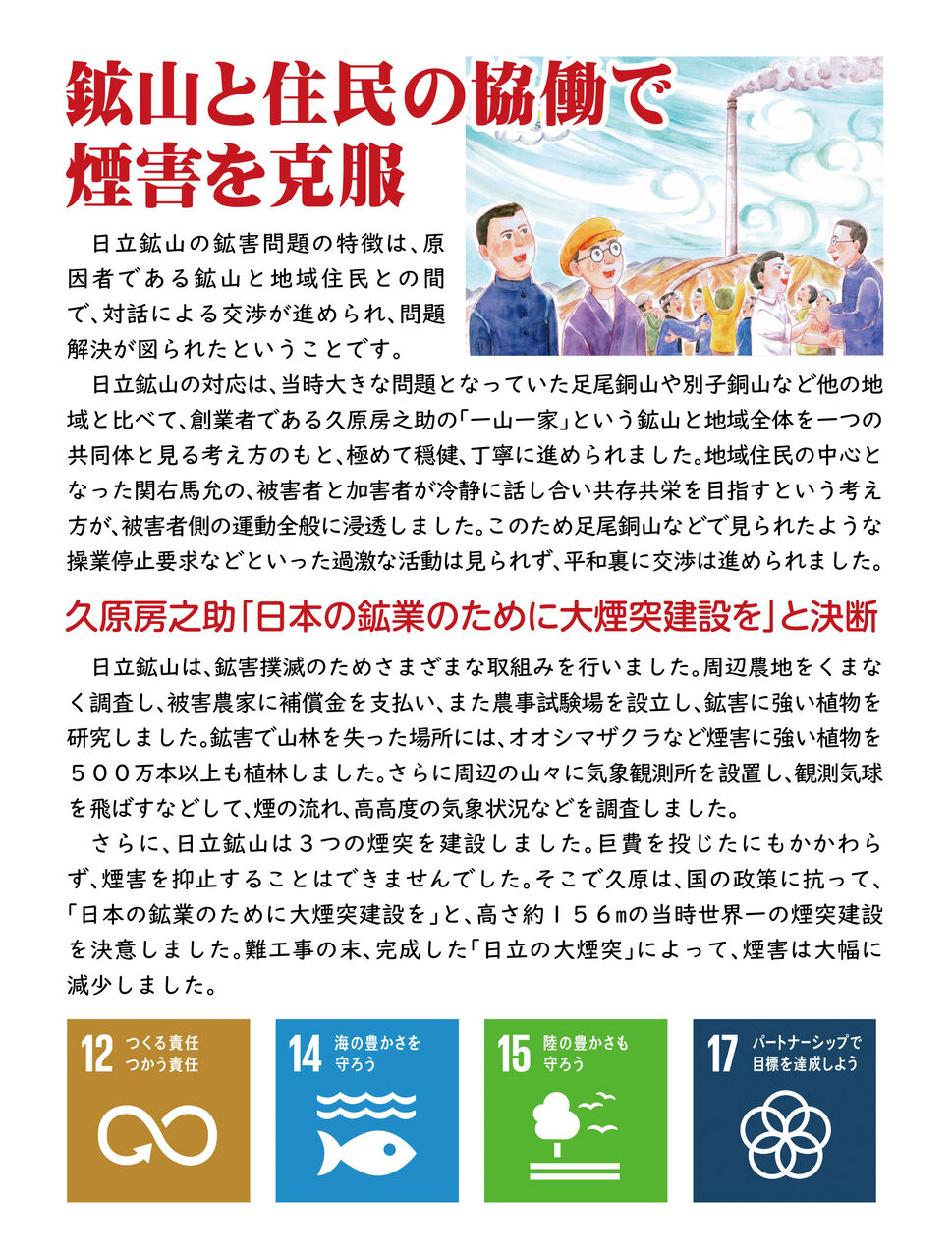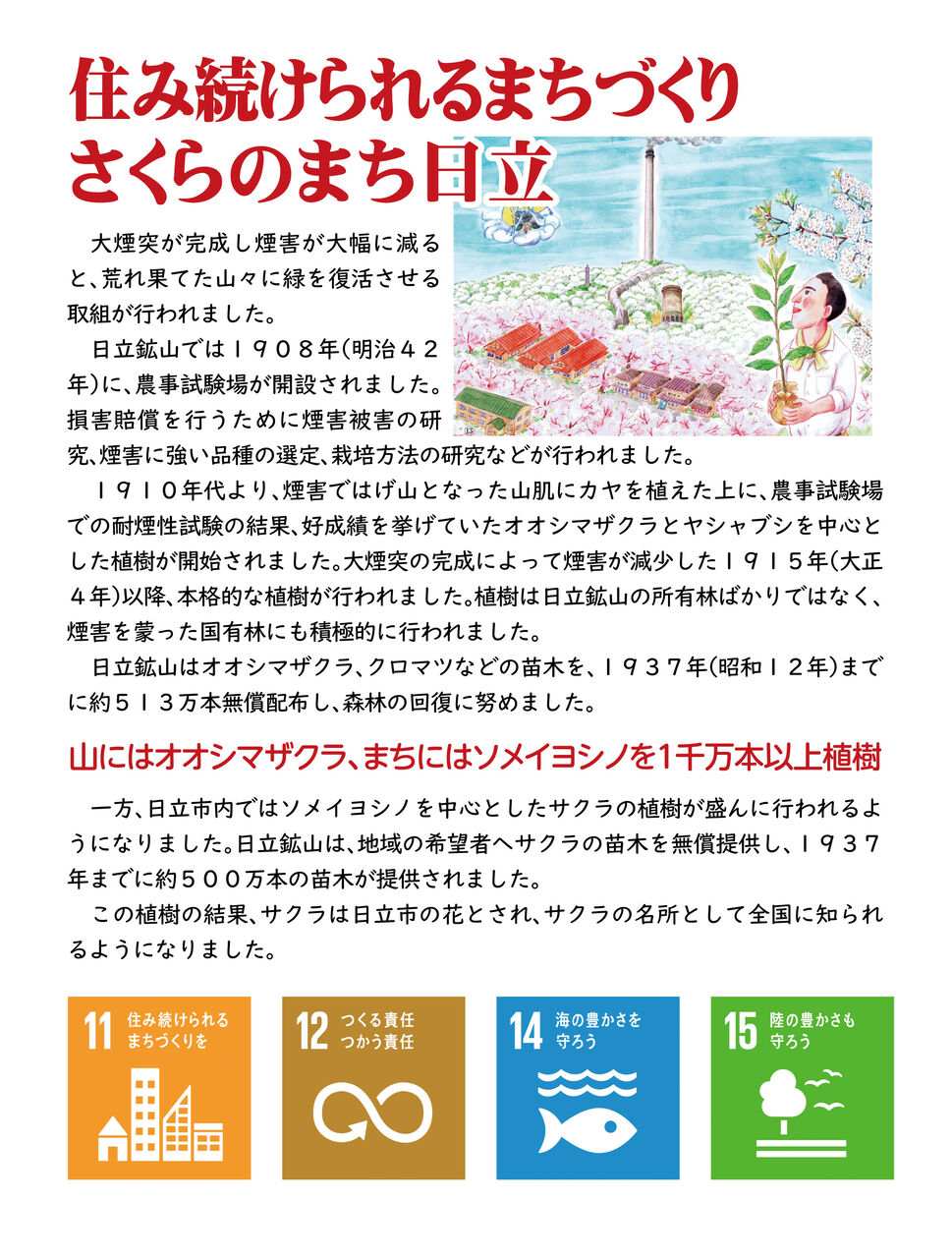 大煙突とさくらのまち、日立の100年の歴史は、SDGsの目標、「8.働きがいも経済成長も」、「11.住み続けられるまちづくりを」、「12.つくる責任つかう責任」、「15.陸の豊かさを守ろう」といった目標に繋がっています。そして、煙突建設の道のりや緑を復活させた過程は、まさに「17.パートナーシップで目標を達成しよう」という目標の体現に他なりません。