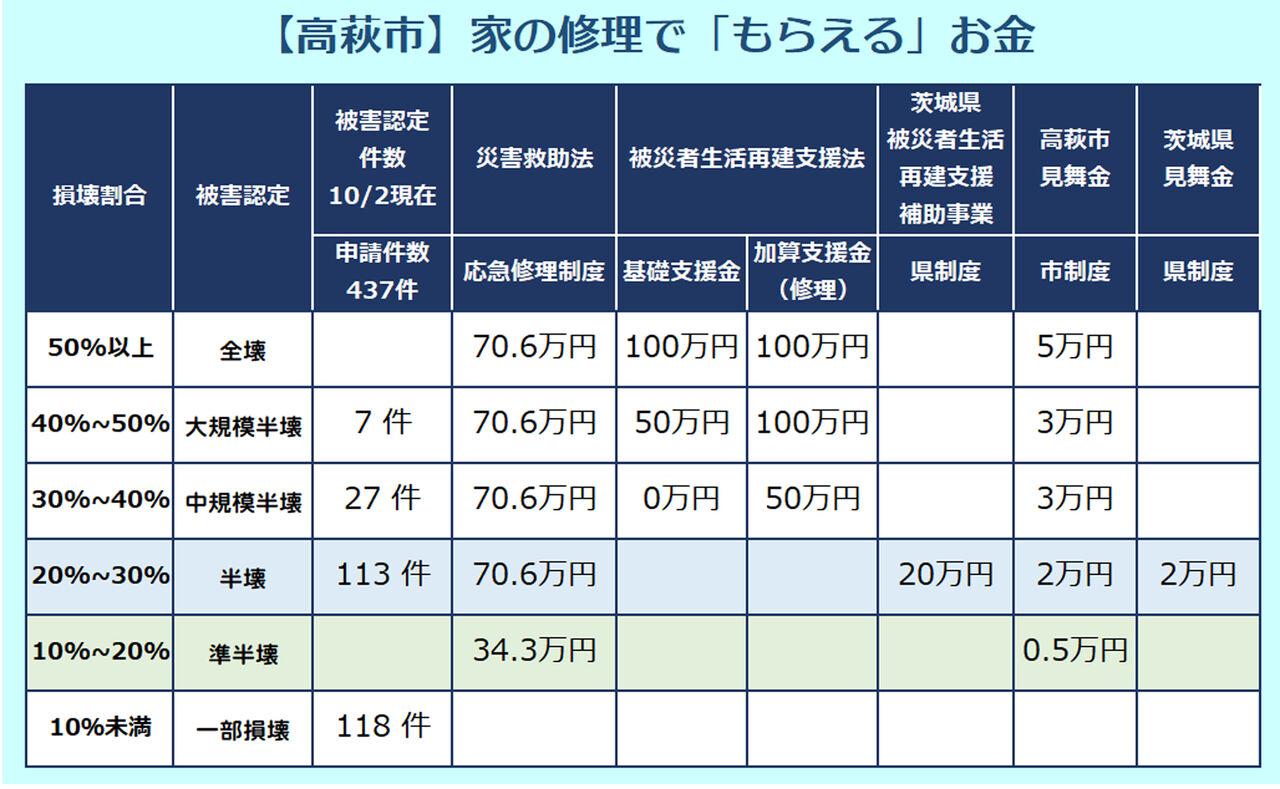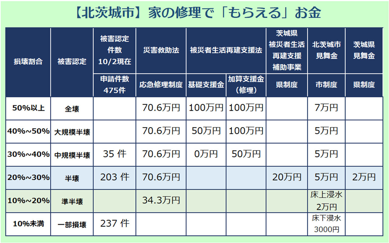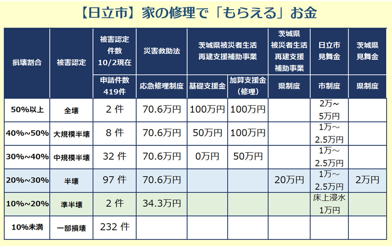 災害救助法の応急修理制度などの公的支援の対象は半壊以上となっているため、一部損壊になった方、特に床上浸水でも一部損壊と認定された方は、もう一度市役所に調査のやり直しを求めた方が良いかもしれません。特に、壁の中に入っている断熱材が浸水している場合もあります。遠慮せずに再調査を申請して下さい。