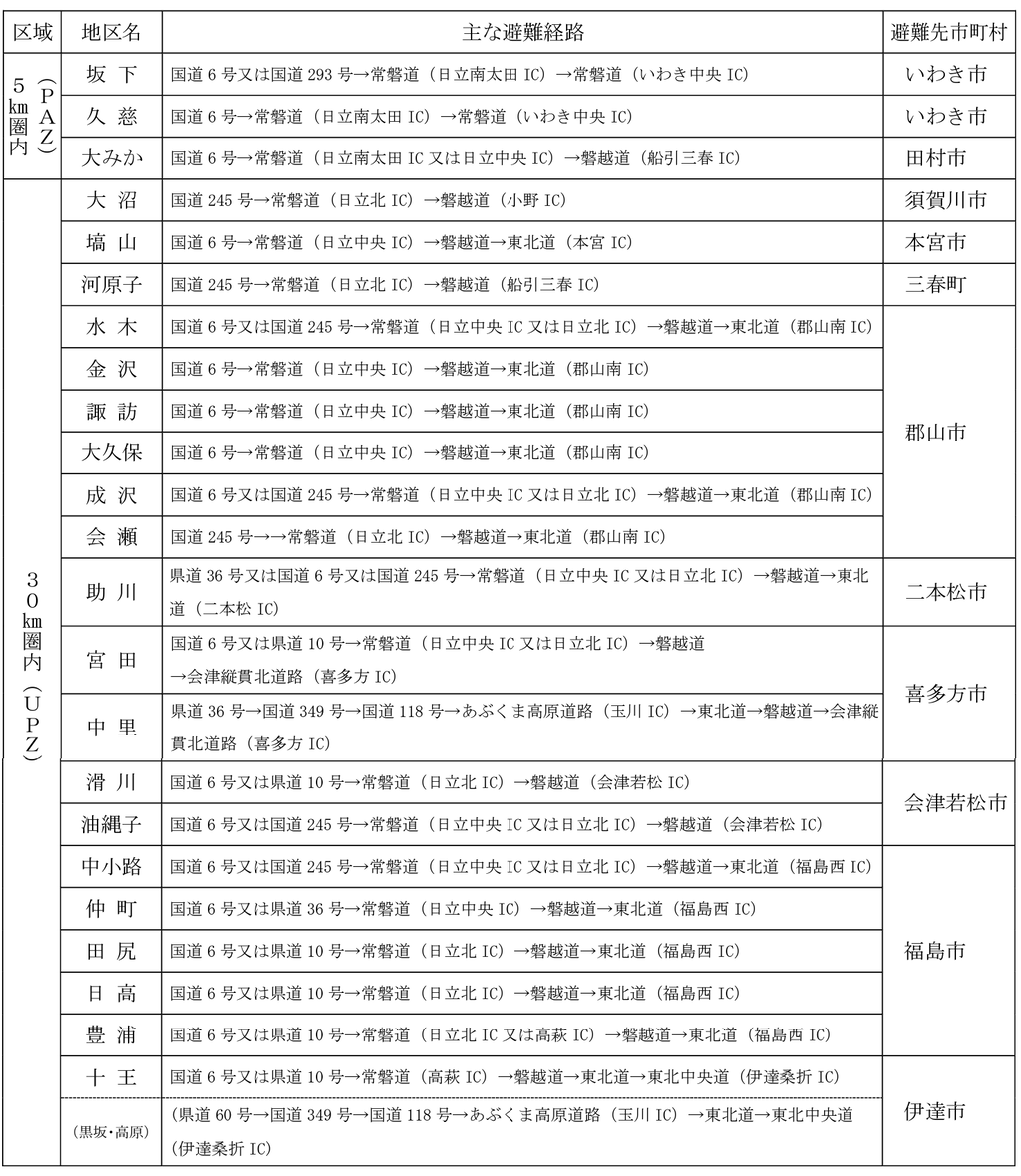 この広域避難計画では、5キロ圏内(PAZ)に住むおよそ2万3000人は、放射性物質が放出される前に福島県いわき市や田村市などに避難します。