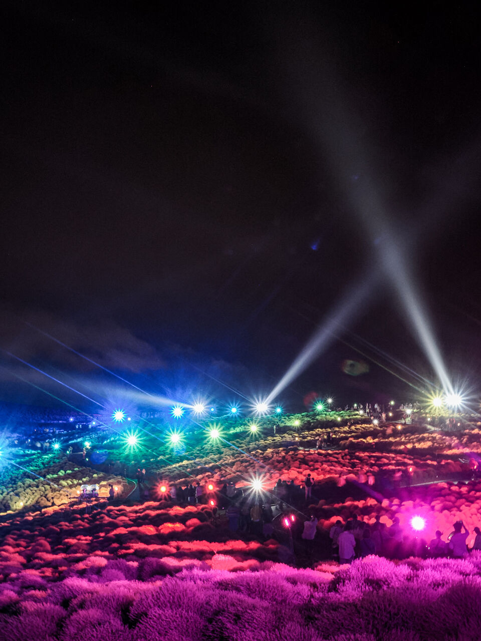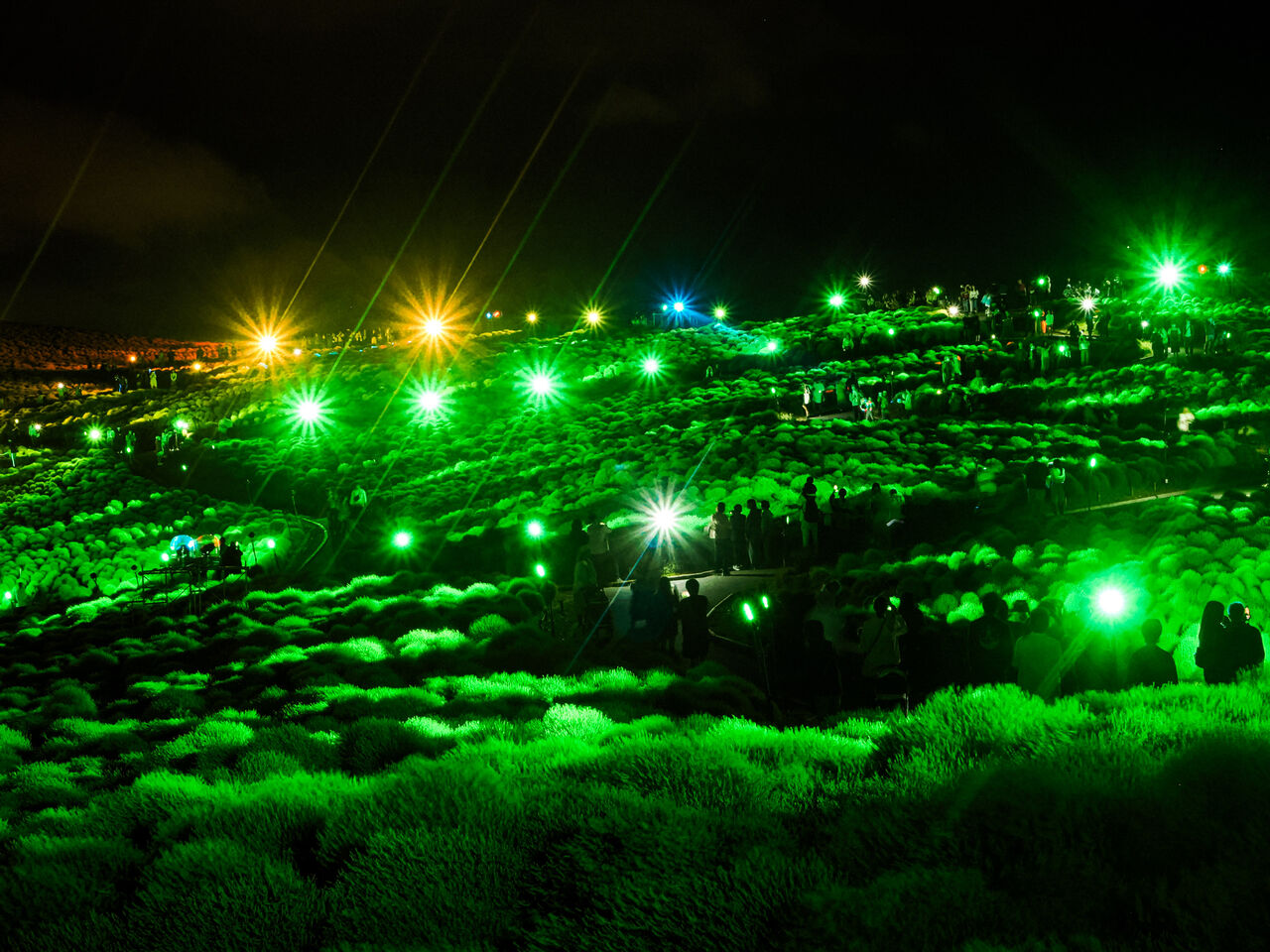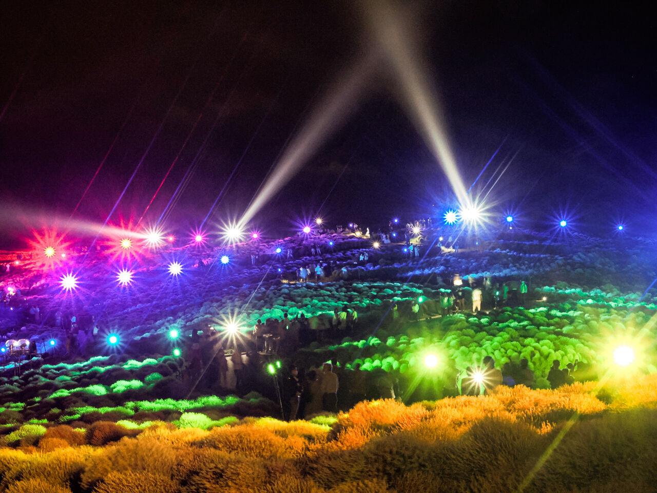 ひたちなか海浜公園の期間限定の絶景「コキアライトアップ2024」。メイン会場のみはらしの丘では、夏の太陽を浴びて大きく成長した約4万本のコキアを、音楽に合わせてカラフルな光で照らし出します。
