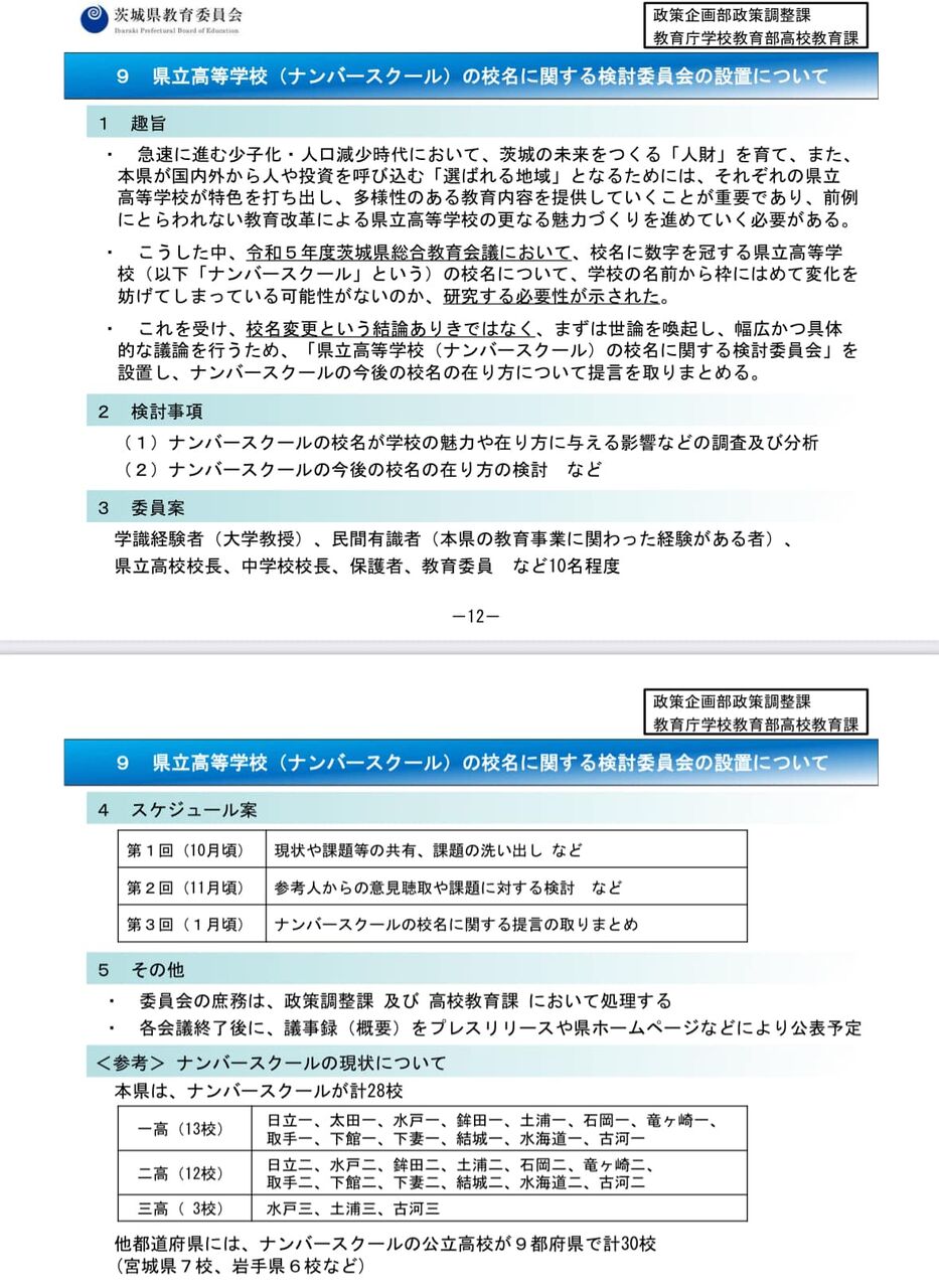 茨城県教育委員庁は、ナンバースクールの名称見直しの方針を撤回。9月19日の県議会文教警察委員会で報告した県立高校の名称見直しのための検討委員会設置を、県議会の強い反対で断念することを明らかにしました。