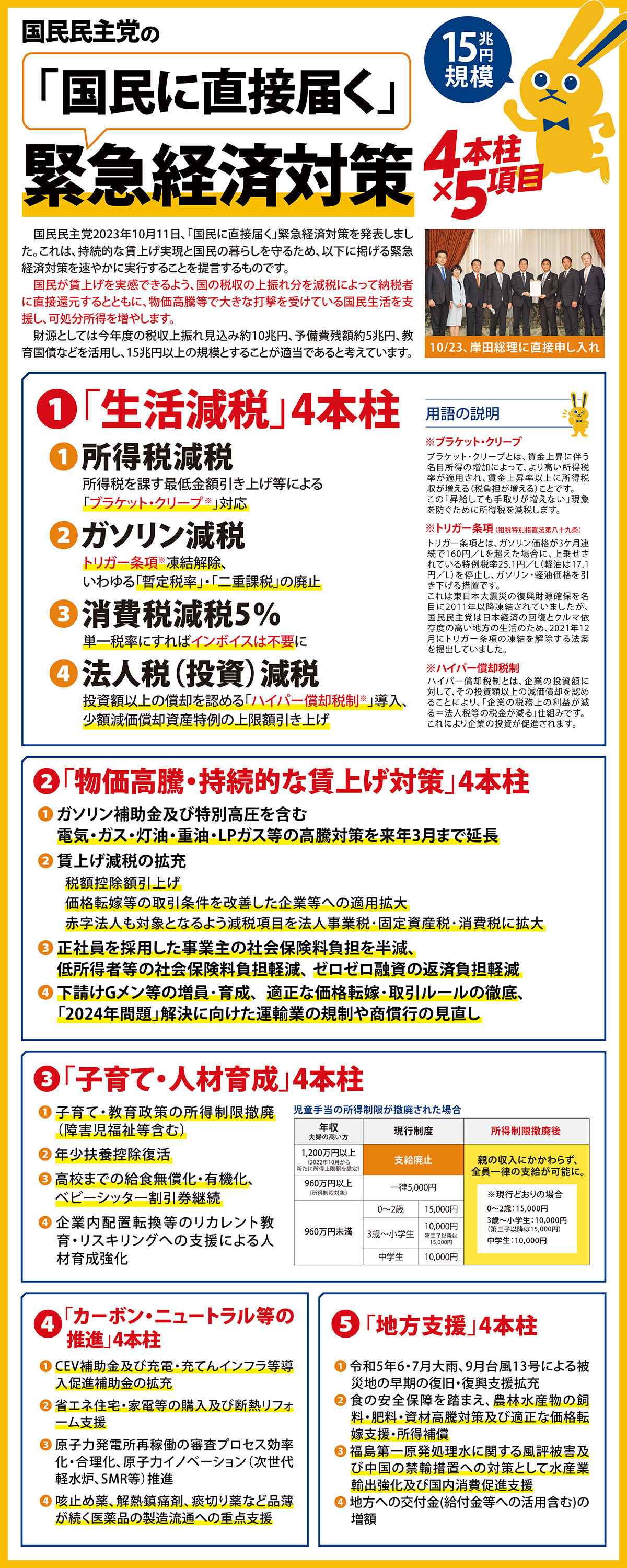 今回の衆院選では、「手取りを増やす」というのはまさに、現役世代をメインターゲットとした政策です。前回2021年の衆院選は「給料を上げる政治」が合い言葉でした。労働者(特に大企業)の給与が上昇し、最低賃金が1000円台を突破した今年、「給料は上がったけれど、手取りの給料は上がっていない」との現役世代の実感に、ダイレクトに答えたキャッチフレーズを掲げました。