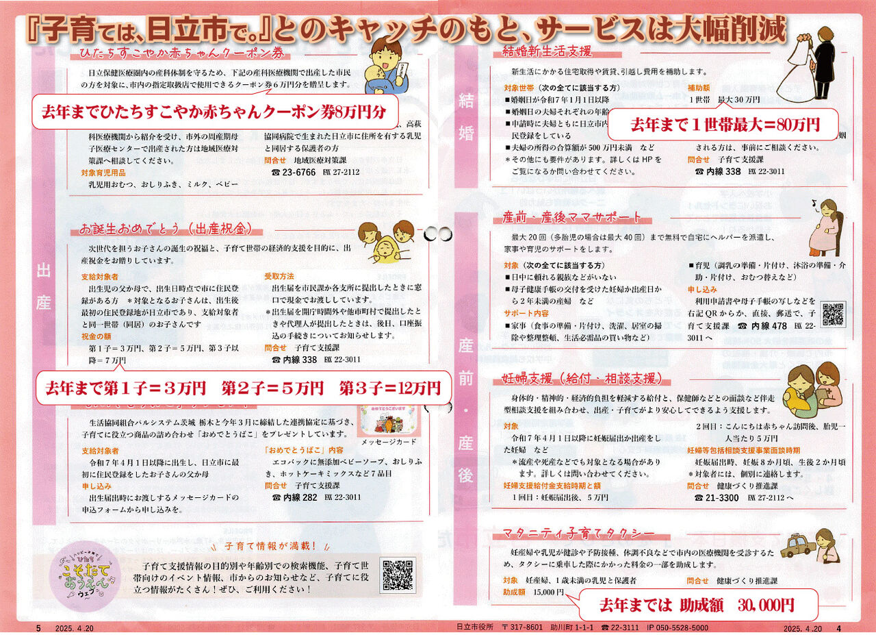¡¡¤½¤ó¤ÊÃæ¡¢ºòÆüÆÏ¤¤¤¿»Ô¤Î¹Êó»æ¡Ö¤Ò¤¿¤Á¡×¡Ê4·î20Æü¹æ¡Ë¤Ë¤Ï¡¢¡Ö»Ò°é¤Æ¤Ï¡¢ÆüΩ»Ô¤Ç¡£¡×¤È¤¤¤¦ÆÃ½¸¤¬Â礤¯ÁÈ¤Þ¤ì¤Æ¤¤¤Þ¤·¤¿¡£³Î¤«¤Ë¡¢¾¯»Ò²½¤È¿Í¸ý¸º¾¯¤¬»ß¤Þ¤é¤Ê¤¤º£¡¢¼¡À¤Âå¤ò°é¤Æ¤ë»Ò°é¤Æ»Ù±ç¤³¤½¡¢10ǯ¸å¡¢20ǯ¸å¤ÎÆüΩ»Ô¤ò»Ù¤¨¤ëºÇ½ÅÍ׻ܺö¤Ç¤¢¤ë¤Ï¤º¤Ç¤¹¡£4¥Ú¡¼¥¸¤È5¥Ú¡¼¥¸¤Î¸«³«¤¤Ë¤Ï¡¢½Ð»º¤«¤é·ëº§¡¢»ºÁ°¡¦»º¸å´ü¤Ë¤ï¤¿¤ë»Ù±çÀ©ÅÙ¤¬¾Ò²ð¤µ¤ì¡¢°ì¸«¤¹¤ë¤È»Ô¤Î»Ò°é¤Æ»Üºö¤ËÎϤ¬Æþ¤Ã¤Æ¤¤¤ë¤è¤¦¤Ë¤â¸«¤¨¤Þ¤¹¡£